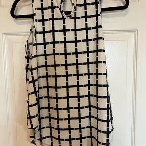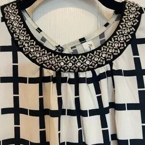 This sleeveless blouse by PerSeption Concept features a striking black and white grid pattern, enhanced with elegant beaded embellishments at the neckline. Its shimmery silhouette offers a modern and chic look, perfect for elevating any outfit.