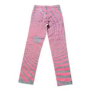 Elevate your denim game with the MSFTSrep Jaden Smith Straight Leg Logo Print Jeans. Featuring a unique blue and pink swirl pattern, these jeans make a bold statement while maintaining a classic straight-leg silhouette. The size 33 jeans offer a comfortable mid-rise and a 31-inch inseam, ensuring a fit that's just right for everyday wear. Crafted from quality cotton denim, these jeans are machine washable for easy care and designed to keep up with your active lifestyle. Light fabric wash and subtle logo accents add a touch of style to the overall look. The 5-pocket design provides practicality, making these jeans a versatile choice for any season – from the brisk fall to the sunny spring.