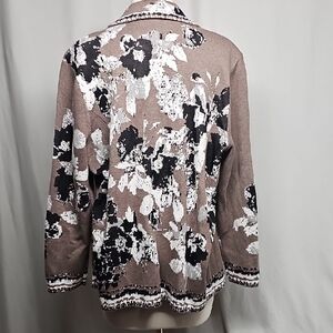 This sophisticated blazer from Chico's features a striking black and white floral pattern, perfect for adding a touch of elegance to any outfit. The classic blazer cut with lapels and softly tailored design makes it versatile for both casual and semi-formal occasions. A decorative trim along the edges adds a unique touch to this stylish piece.