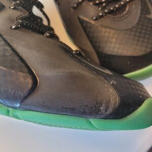 Experience the perfect blend of style and functionality with these Nike sneakers, featuring a striking black and green color palette. The high-top design offers excellent support, while the color-shifting accents add a unique visual flair. Crafted from premium materials, these sneakers promise durability and comfort for everyday wear. (minnor scratches).