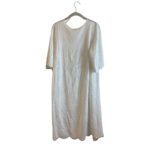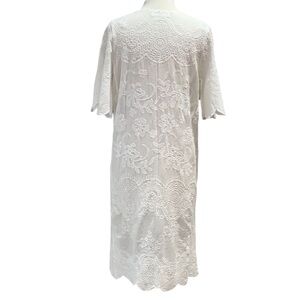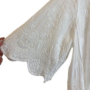 Kindred White Embroidered Floral Open Front Kimono Duster. Made from soft white cotton with embroidered details throughout. Short-sleeved with scalloped hem. Machine washable and tumble dry. Pre-owned in good condition.