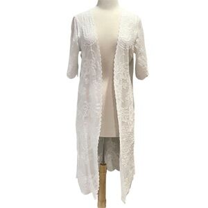 Kindred White Embroidered Floral Open Front Kimono Duster Sz L Beach Casual