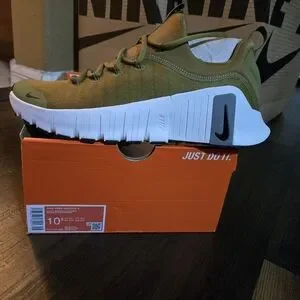 Stylish Nike athletic shoes. Olive green upper with white sole. Black accents for a sleek look. Perfect for sports and casual wear.