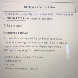 Infinity - when love is forever!! link chain necklace 18” - strong chain with 1” infinity symbol. Tiffany & co sterling silver, box, ribbon, pouch. Sold out in North America.