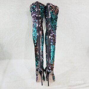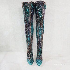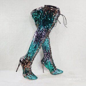 Over the Knee Thigh High Lace Up Stiletto Heel Sequin Boots Pewter