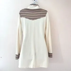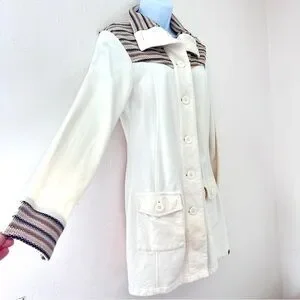Multicolor stripped sweater knit at sleeve cuffs, front yoke, back yoke, and collar facing
