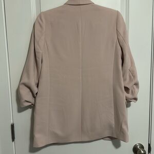 This Express blazer in a soft pink hue features a relaxed, open-front design with 3/4 length ruched sleeves. Crafted from lightweight fabric, it offers a modern oversized silhouette perfect for both business and casual settings.