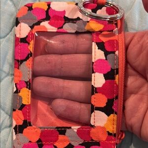 Small ID wallet with key ring. IS window has normal wear marks and can come clean. Otherwise it’s very clean.