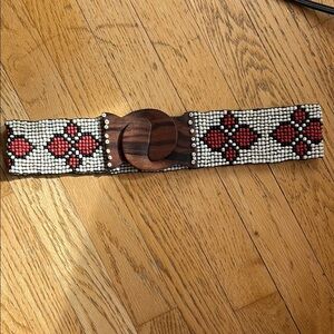 Elevate your style with this beaded belt featuring a unique wooden clasp. Adds a touch of elegance to any outfit.