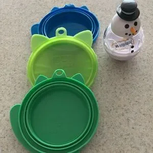 Cat food can covers & Snowman Treat Dispenser. Fits up to 5.5 oz can. Snowman rocks and dispenses treats thru opening on body. Cats love to play with this rocking snowman. Set of 3 can covers with cute cat faces on each.
