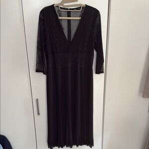 This sophisticated black dress from Zara features a flattering V-neckline and 3/4 sleeves, perfect for a cocktail night out. The A-line silhouette is enhanced by a pleated wrap design, offering a graceful flow with every step.