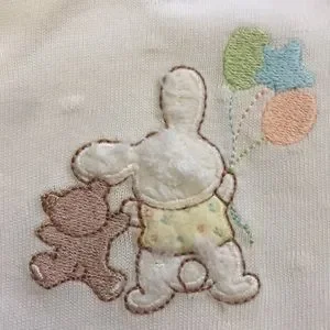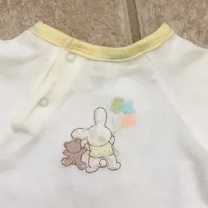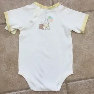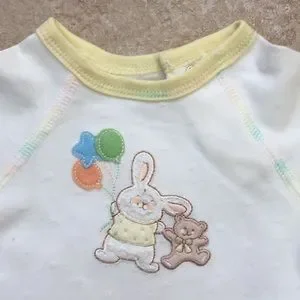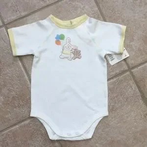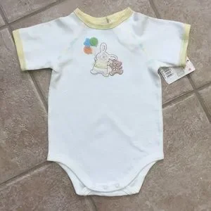 Light yellow short sleeve bodysuit featuring an embroidered appliqué of a fuzzy white bunny wearing a yellow top holding green, yellow, and orange balloons hopping along with his pal, a brown teddy bear in a yellow bow tie; the opposing scene is embroidered on the back; yellow trim on collar and cuffs