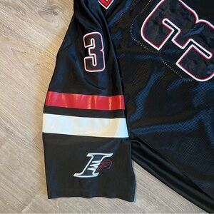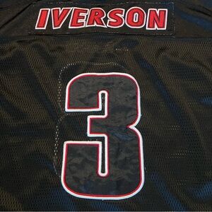 Experience the iconic Reebok Iverson Jersey, showcasing a bold black and red color scheme. Crafted from premium sports material, this jersey features 'IVERSON' and the number '3' prominently on the back, ensuring a standout look. Perfect for sports enthusiasts, it combines a classic athletic cut with modern design elements for ultimate comfort and style.