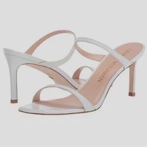 Brand new in box with dustbag . Never worn. These Stuart Weitzman heels feature a sleek and minimalist design in a pristine white color. The high heel and overlapping leather bands create a sophisticated look, perfect for adding a touch of elegance to any outfit.