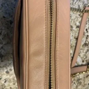 This tan crossbody bag showcases a refined quilted design, perfect for adding a touch of elegance to your daily ensemble. Its structured, camera bag-style shape is enhanced by a gold-tone chain strap and emblem, making it a versatile accessory for any occasion. EUC. Very minimal signs of wear. Smoke and pet free home. Dust bag included.