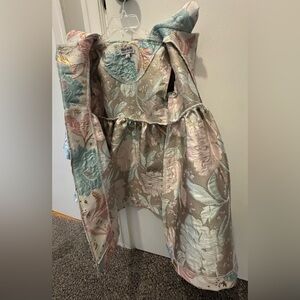 Elegant floral dress with long sleeves. Features a mix of pastel colors and gold accents. Perfect for formal occasions.