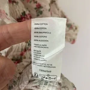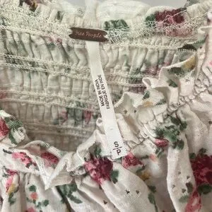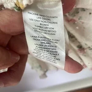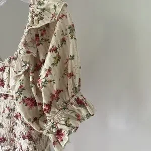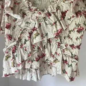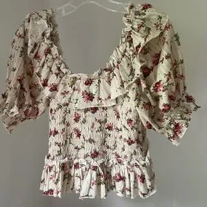 Sweet & flirty top features a cross-front design and floral print with exaggerated ruffle detailing and smocking at bodice for an added flattering fit. Slightly longer in back then front. V-neck with rounded open back. Pre owned, like new condition. Material is 100% cotton. Machine wash.