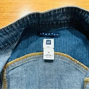 Light blue denim jacket with stretch fabric. Features a classic collar and durable stitching.