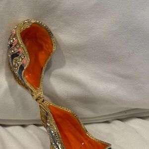 Add a splash of sparkle to your shelf with this whimsical vintage fish-shaped tchotchke trinket box by QIFU. Hand-painted in vibrant blue, gold, pink, and orange enamel with dazzling rhinestone accents, this hinged collectible opens to reveal a bright orange interior—perfect for storing small treasures like rings, pills, or love notes.