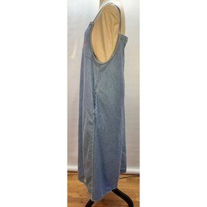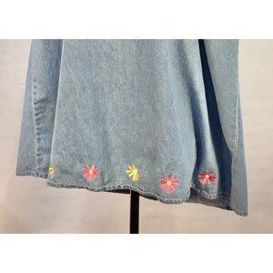This denim jumper dress features a charming floral embroidery, adjustable straps with metallic accents, and a relaxed fit. Suitable for casual wear.