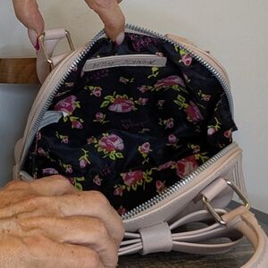 This chic mini bag by Betsey Johnson showcases a delightful bow accent on its structured pink exterior, offering a blend of elegance and playfulness. Crafted from high-quality materials, it boasts a smooth finish and a sophisticated design, making it a versatile accessory for any occasion.