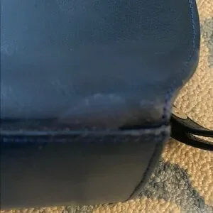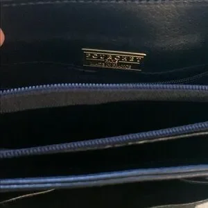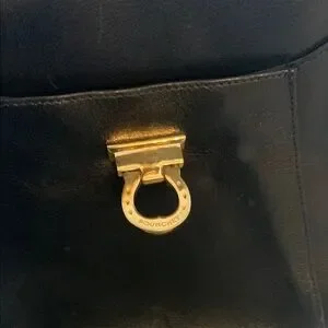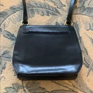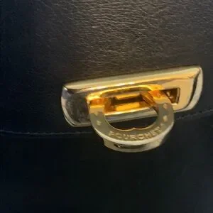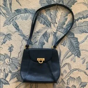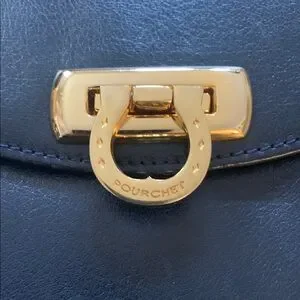 This medium-sized shoulder bag features a sleek navy blue leather exterior with a structured silhouette, complemented by a gold-tone clasp for a touch of elegance. Its shape, shoulder strap, gold hardware and timeless design make it a versatile accessory for any occasion. The lining inside has some rips, but this could be repaired or replaced. Stunning vintage bag! The leather is so beautiful (see photos for some minor wear spots).
