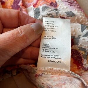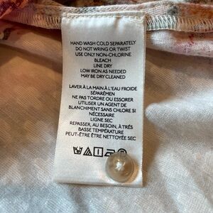 This Pilcro blouse showcases a vibrant floral print in pink and orange hues, set against an ivory background. Designed with a notched collar and 3/4 cuffed sleeves, it offers a relaxed fit perfect for a stylish yet comfortable look. Fabric has great texture. High-low hem. Very good used condition. The Pilcro brand is sold at Anthropologie.