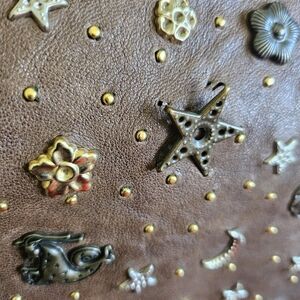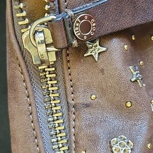 Call out - one of the star studs is pulling away at 2 out of the 5 pins. This can be repaired at the cobbler, or maybe repaired using super glue or leather glue. Tiny water mark at zipper. See pictures. Price takes this into consideration. This bag is discontinued!
