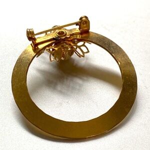 Vintage, lovely etched, Gold Floral faux Pearl brooch. Size: 2". This exquisite gold brooch features a delicate floral design with a central pearl, perfect for adding a touch of elegance to any outfit. Beautiful condition super cute open circle etched with floral detail.