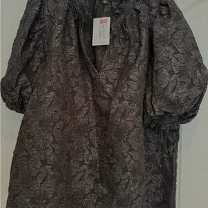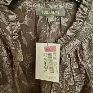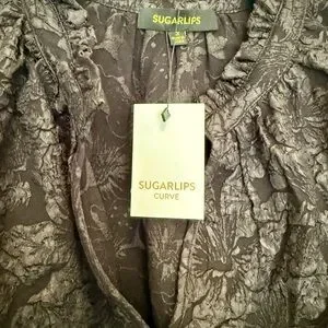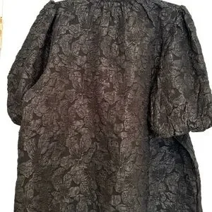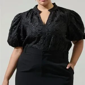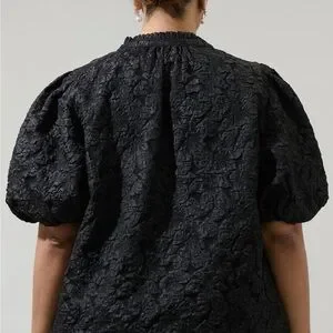 Experience effortless elegance with Sugarlips' black jacquard top, featuring a split v-neck and short, puff balloon sleeves with drop shoulders and elastic at the end.