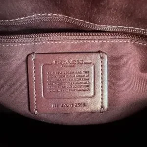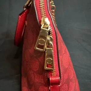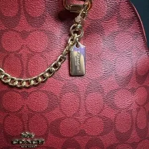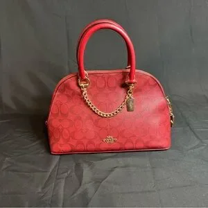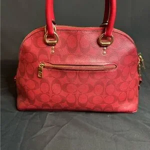 This Coach satchel in a striking red hue features a structured dome shape and elegant gold-tone hardware. The embossed monogram pattern and smooth leather handles add a touch of sophistication, making it a perfect everyday accessory.