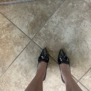 These Coach heels feature a sleek pointed-toe design crafted from glossy metallic patent leather, offering a sophisticated and modern look. The decorative and subtle hardware detail adds a touch of elegance, making them perfect for formal or business wear. With a nice heel and low-cut topline, these shoes provide both style and comfort for any professional setting.
