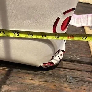 This Christian Louboutin tote bag features a striking combination of white and red, adorned with elegant decorative patterns. Its double handles and spacious interior offer both style and practicality, making it a standout accessory for any occasion.