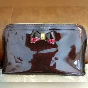 Loaded Beauty Bundle in this Ted Baker cosmetic bag in a rich burgundy glitter hue features a sleek, patent leather-like finish and a charming bow accent. Its medium size makes it perfect for organizing beauty essentials or personal items, while the glossy exterior adds a touch of elegance to your daily routine.q