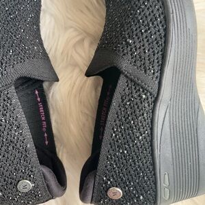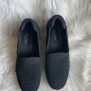 Experience the perfect blend of comfort and style with these Skechers black flats. Featuring a subtle shimmer effect, these slip-on shoes are ideal for casual occasions. The simple, elegant design ensures they are a versatile addition to any wardrobe.