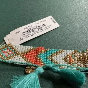 Lucky Brand beaded bracelet in coral, turquoise, and white. Bracelet is 9" around at the longest and 6" at the shortest. The beading is about 3/4 inch wide. This has never been worn.
