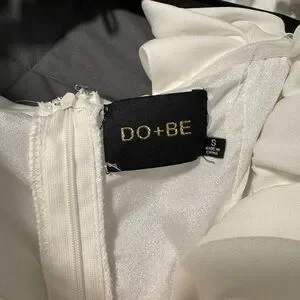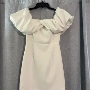 This white sheath dress by DO+BE features a striking ruffled off-the-shoulder neckline, perfect for a bride or wedding guest. The sleeveless design with puff sleeves adds a touch of elegance, making it ideal for cocktail events or brides!