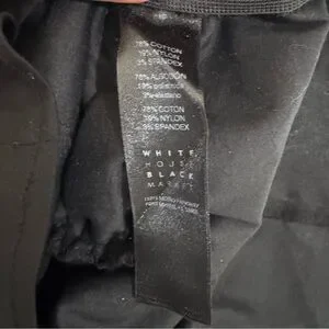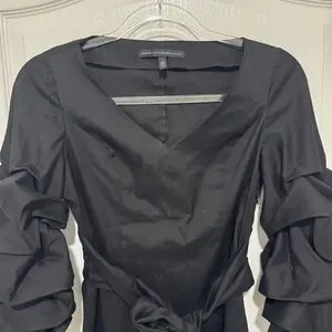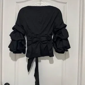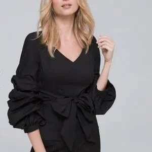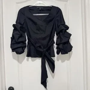 White House Black Market Black Ruffle Sleeve Blouse. This blouse features a V-neck, long sleeves with ruffled detailing at the cuffs, and a tie-waist belt.