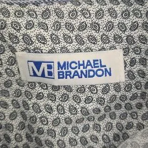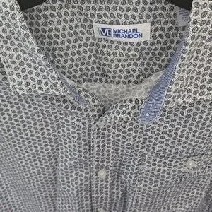 Excellent used condition. XL. 55% Cotton. 45% Polyester. Elevate your wardrobe with the Michael Brandon Men's Blue print Short Sleeve Shirt. Perfect for casual outings, this shirt offers comfort and style. The subtle blue pattern adds a touch of sophistication to any look. chest 22.75 inches. length 29 inches. front pocket. comfortable. B 10