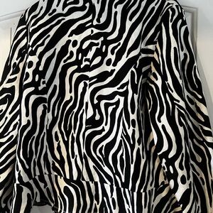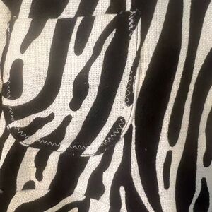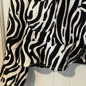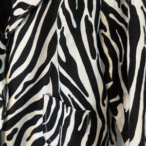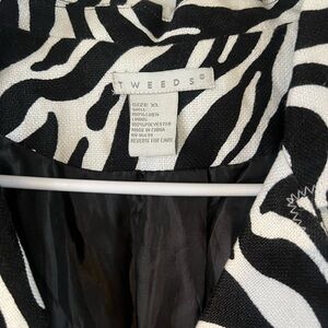 This striking blazer from Tweeds features a bold zebra print in black and white, crafted from a structured fabric for a fitted silhouette. The blazer-style jacket is designed with a classic collar and lapels, making it a standout piece in any wardrobe.