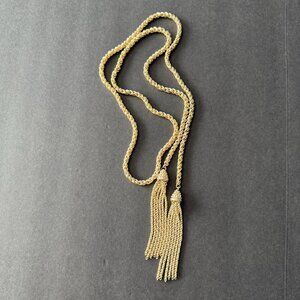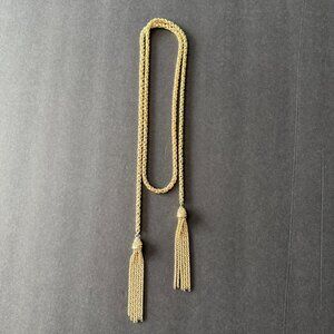 This Kendra Scott lariat necklace features a sophisticated rope chain with tassel ends, showcasing timeless elegance. A versatile, adjustable design for formal and professional settings. This piece has some weight to it and could also be used as a belt depending on your size.