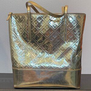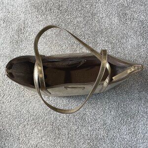 This beautiful metallic gold tote is embossed with the iconic KS spade pattern and features the Kate Spade plaque. It has a wide base and stands up on its own, with a roomy lined interior, zipper top, two slip interior pockets and one zipper interior pocket. This bag is gently used and in great condition, but has some small scuffs and visible wear where the straps connect to the bag.