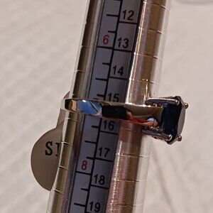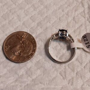 This fashion ring is metal alloy with silver tone rhodium plating and has a deep vivid royal blue oval cut simulated sapphire that is approximately 2 carats set in a prong style setting.