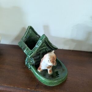 This is a vintage Shawnee Pottery Dog House and Puppy Planter, likely from the mid-20th century. Shawnee Pottery was produced in Zanesville, Ohio, from 1937 to 1961. This particular piece features a green dog house shaped planter with a brown and white cocker spaniel puppy figure. Has some spots in glaze as shown in last picture on top of "house"