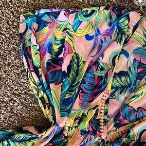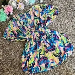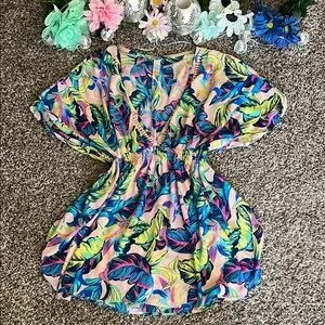 Bright and colorful dress with a tropical leaf pattern. Features a mix of pink, blue, and green hues.
