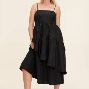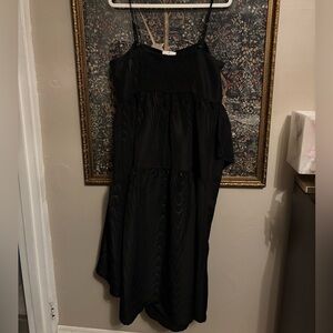 This chic black sundress features a sleeveless design with spaghetti straps and a square neckline. The asymmetrical tiered skirt adds a modern twist, while the fit-and-flare silhouette ensures a flattering fit for a cocktail or night out.