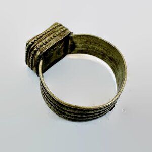 Fabulous nomadic statement ring! This is an old ring that is made from mixed metals and it has a dark soft gold coloring to it. It is set with a faceted pink jewel that has been aged by the desert sand. The band has a lined pattern. Great old ring to wear on it's own or stack with more Afghan rings!