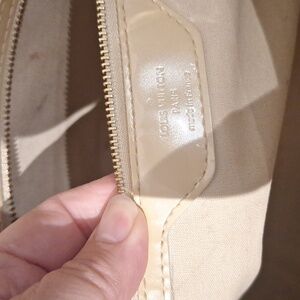 this cream iridescent color patent leather Louis Vuitton tote is 14 in Long 10 and 1/2 in tall without the handle 17 and a half with handle and 5 in wide. ****has some wear on the corners and the back side handles as pictured and inside has several marks and stains. see pictures, hence the price. still has lots of love to give.