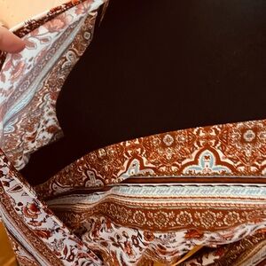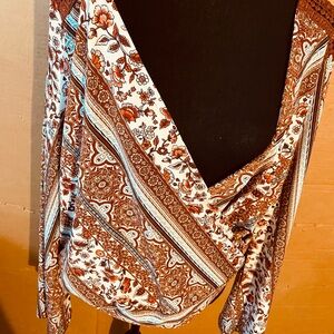 This elegant Venus blouse features a sophisticated wrap design in rich brown and white hues. The long sleeves and intricate pattern make it a standout piece for any occasion. Crafted for comfort, it offers a stylish blend of boho and vintage-inspired aesthetics.