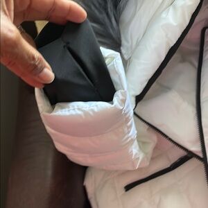 Stylish white puffer jacket by Nautica. Features a cozy faux fur hood. Perfect for cold weather. Falls at hip level. Pockets have black zipper closings for security of your items.
